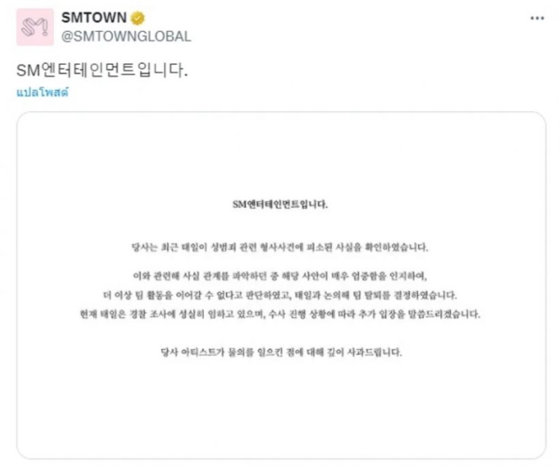 กลายเป็นประเด็นร้องแรงและสร้างความตกใจให้กับแฟนคลับอย่างมาก ที่ล่าสุดทางต้นสังกัด SM Entertainmen ได้ออกมาประกาศว่า แทอิล สมาชิกวงบอยแบรนด์ NCT ถูกถอดถอนจากการเป็นสมาชิกวงแล้ว เนื่องจากถูกฟ้องร้องในคดีอาญาที่เกี่ยวกับอาชญากรรมทางเพศ
