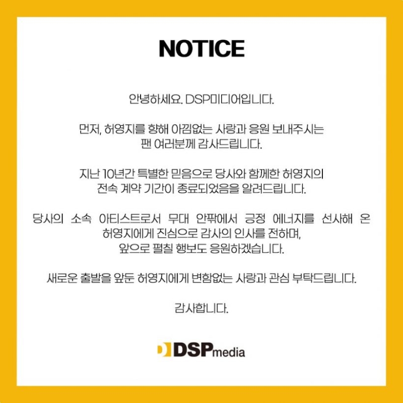 คำชี้แจงอย่างเป็นทางการของ DSP Media มีดังนี้ สวัสดีนี่คือ DSP Media ก่อนอื่นเราอยากจะขอขอบคุณแฟน ๆ ที่แสดงความรักและการสนับสนุนอย่างไม่ลดละต่อ ฮอยองจี เราขอแจ้งให้ทราบว่าสัญญาพิเศษของเรากับ ฮอยองจี ซึ่งอยู่กับเรามากว่า 10 ปี ด้วยสัญญาแห่งความไว้วางใจอันยอดเยี่ยมได้สิ้นสุดลงแล้ว