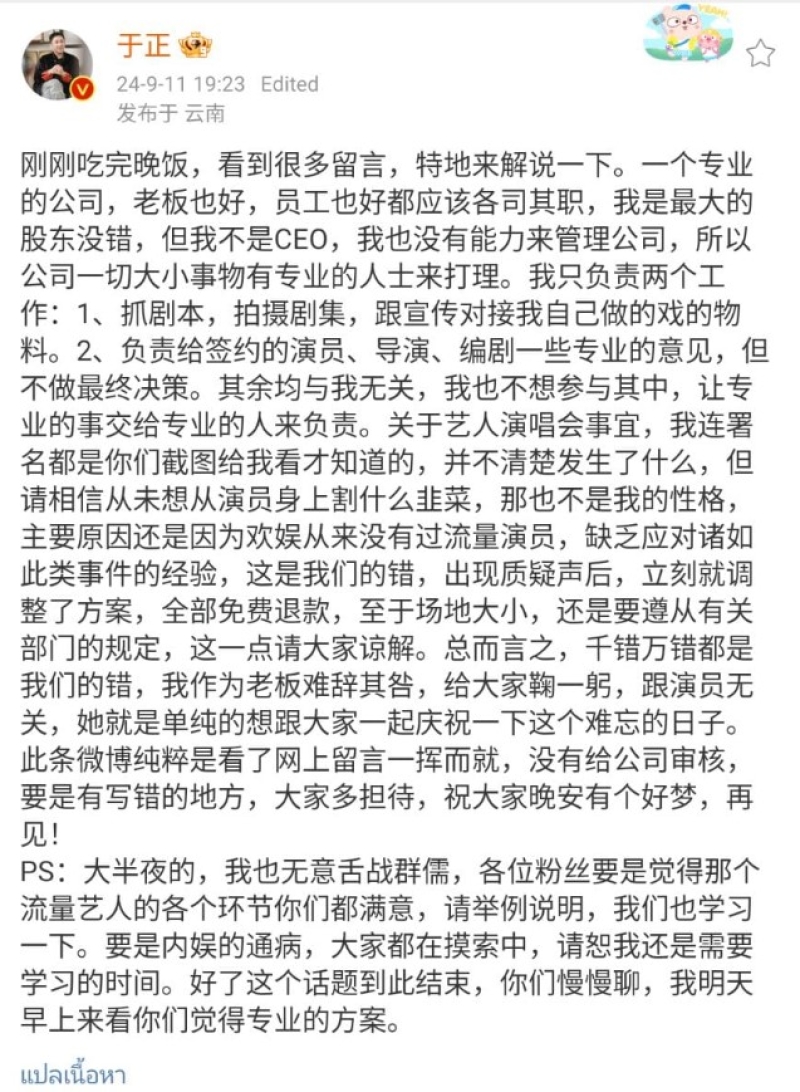 อวี่เจิ้งบอกว่า เขาอ่านคอมเม้นต์ชาวเน็ตมาหลายวันแล้วทนไม่ไหวต้องออกมาชี้แจง โดยบอกว่าถึงเขาจะเป็นผู้ถือหุ้นรายใหญ่ที่สุด แต่เขาไม่ใช่ CEO ไม่มีอำนาจในการบริหารค่าย งานบริหารต้องใช้มืออาชีพที่เชี่ยวชาญ ตัวเค้าไม่เชี่ยวชาญ จึงให้คนอื่นทำแทน