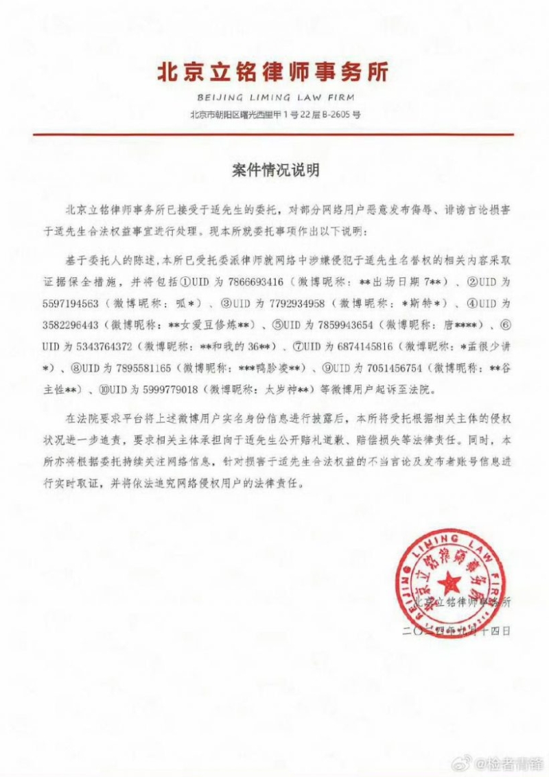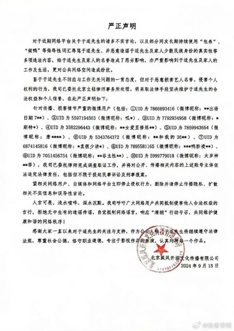 เรียกได้ว่าเป็นอีกหนึ่งพระเอกดังที่โดนปล่อยข่าวต่างๆนาๆสำหรับ อวี๋ซื่อ พระเอกดังจากหนัง ฮ่องสิน Creation of the Gods I และ ปฏิบัติการจ้าวเวหา ได้ออกหนังสือแถลงการณ์บอกว่าได้มอบหมายให้สำนักงานทนายชื่อดัง ฟ้องร้องชาวเน็ตหลาย ID ข้อหาละเมิดสิทธิของเค้า ที่พากันลงรูปในอดีตของเค้าและเขียนกล่าวหาเค้าเสียๆหายๆ