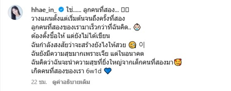 โดย แฮอิน ได้เผยภาพอัลตร้าซาวด์ และที่ตรวจครรภ์ 2 ขัดผ่านไอจี พร้อมข้อความข่าวดีว่า ...ใช่แล้ว... มันเป็นครั้งที่สองของเรา!