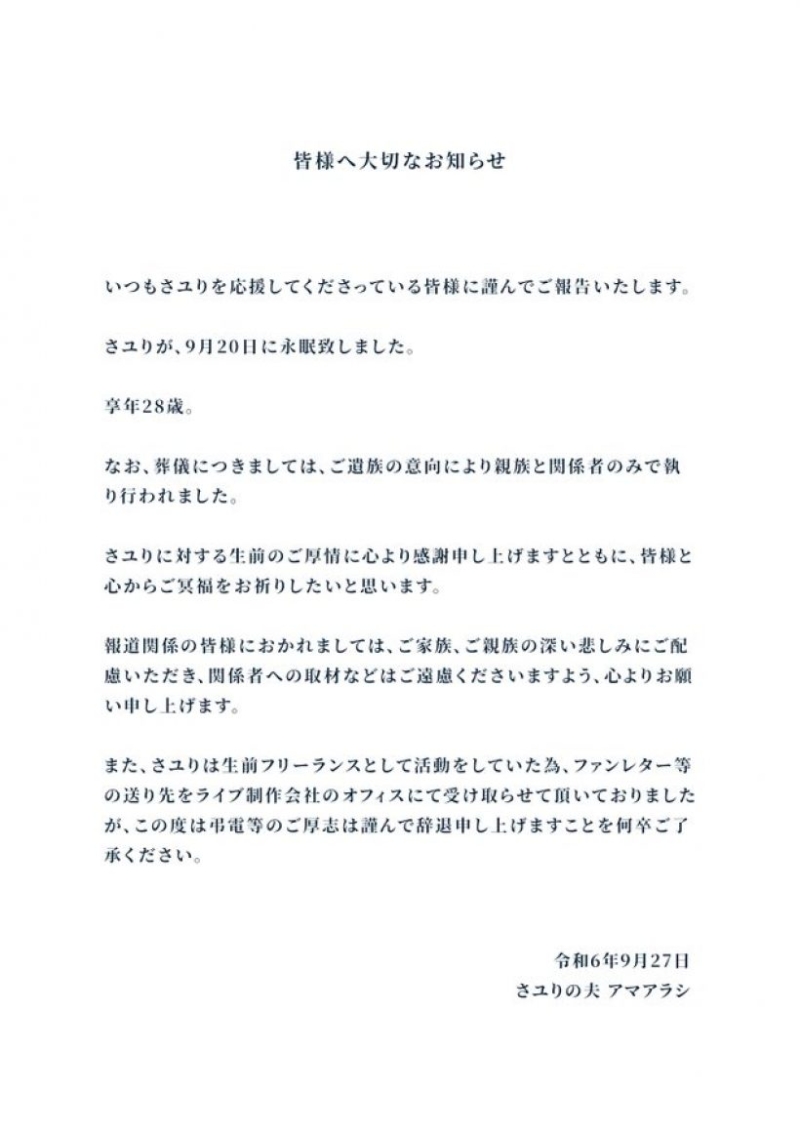 โดยมีเพียงญาติสนิทและคนรู้จักเท่านั้นที่มาร่วมงานเราขอขอบคุณอย่างจริงใจสำหรับการสนับสนุนซายูริในช่วงชีวิตของเธอ และเราอยากจะอธิษฐานขอให้เธอมีสันติสุขชั่วนิรันดร์ร่วมกับคุณ เราขอให้สื่อมวลชนเคารพความเศร้าโศกอันสุดซึ้งของครอบครัว และงดการติดต่อหรือสัมภาษณ์บุคคลที่เกี่ยวข้อง