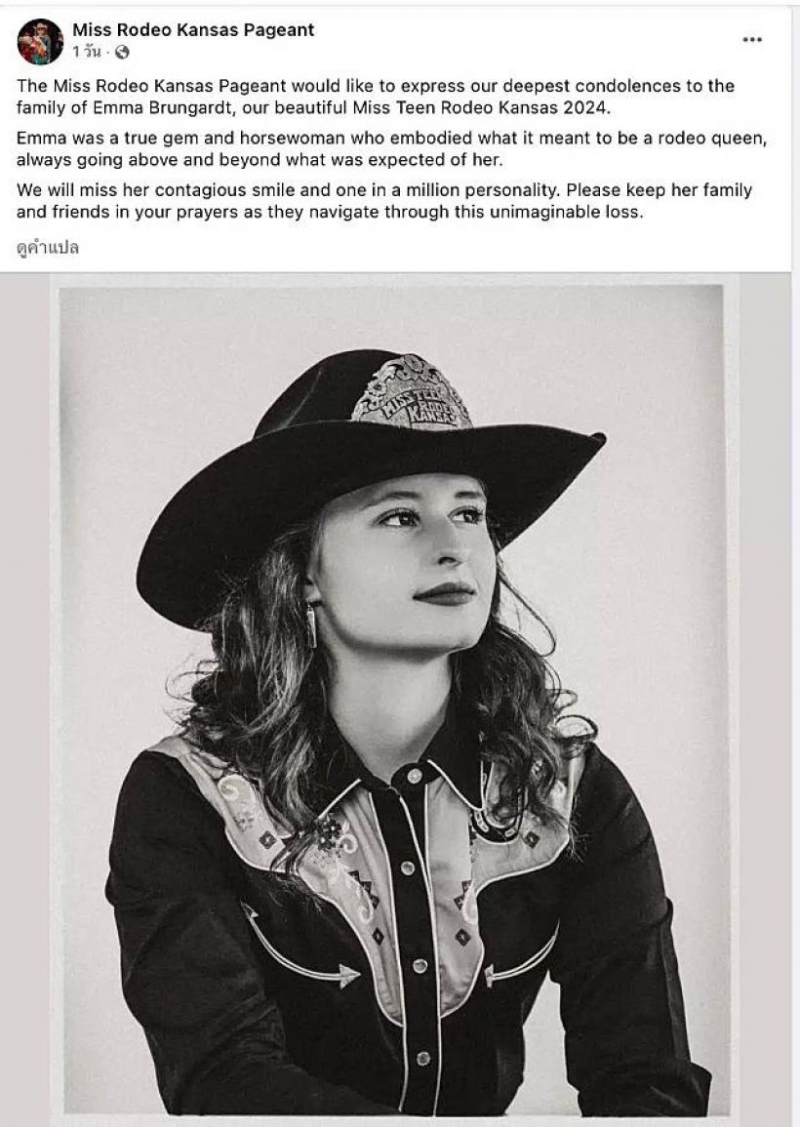 เรียกได้ว่าเป็นอีกหนึ่งข่าวเศร้าที่โลกออนไลน์เข้ามาแสดงความมเสียใจกันเป็นจำนวนมาก หลังสื่อต่างประเทศได้เผยแพร่เรื่องราวของเอ็มมา บรุงการ์ดท์ นางงาม Miss Teen Rodeo Kansas 2024 เสียชีวิตจากอุบัติเหตุรถยนต์ในรัฐแคนซัสเมื่อคืนวันศุกร์ที่ผ่านมา