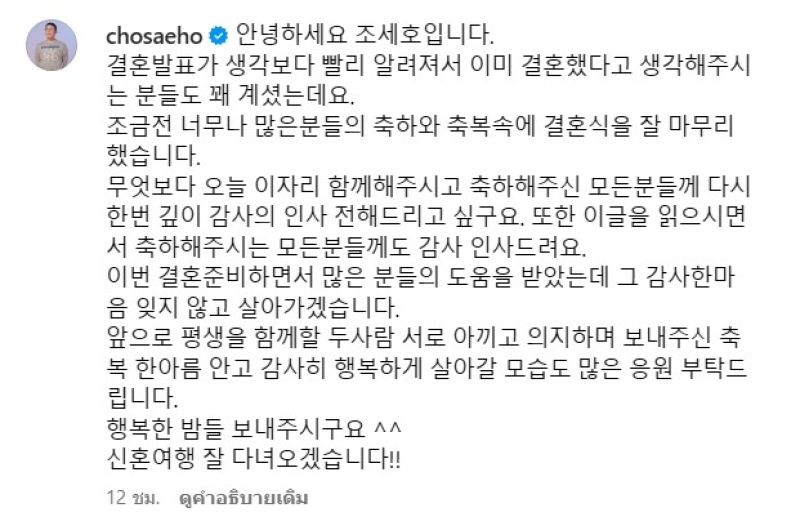 โดย ได้โพสต์บนอินสตาแกรมว่า สวัสดี นี่คือโจเซโฮ ประกาศแต่งงานกลายเป็นที่รู้จักเร็วกว่าที่คาด ดังนั้นจึงมีคนจำนวนไม่น้อยที่คิดว่าตนแต่งงานแล้ว พิธีแต่งงานจบลงไปเมื่อไม่นานมานี้พร้อมกับการแสดงความยินดีและคำอวยพรจากผู้คนมากมาย เหนือสิ่งอื่นใด ฉันอยากจะแสดงความขอบคุณอย่างสุดซึ้งต่อทุกคนที่มาอยู่ที่นี่ในวันนี้และแสดงความยินดีกับฉันอีกครั้ง ฉันอยากจะขอบคุณทุกคนที่อ่านข้อความนี้และแสดงความยินดีกับฉันด้วย