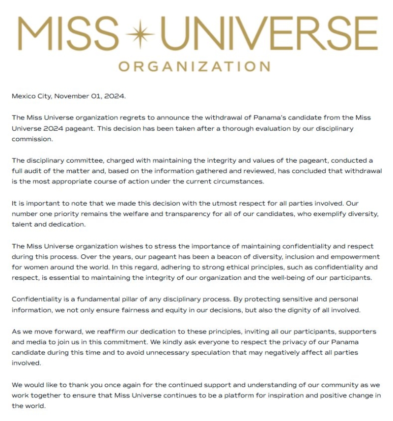องค์กร Miss Universe ต้องการเน้นย้ำถึงความสำคัญของการรักษาความลับและความเคารพในกระบวนการนี้ ตลอดหลายปีที่ผ่านมา การประกวดของเราเป็นประภาคารแห่งความหลากหลาย การรวมกลุ่ม และการเสริมพลังให้กับผู้หญิงทั่วโลก ในเรื่องนี้ การยึดมั่นในหลักจริยธรรมที่เข้มแข็ง เช่น การรักษาความลับและความเคารพ ถือเป็นสิ่งสำคัญในการรักษาความซื่อสัตย์สุจริตขององค์กรและความเป็นอยู่ที่ดีของผู้เข้าร่วมการประกวด