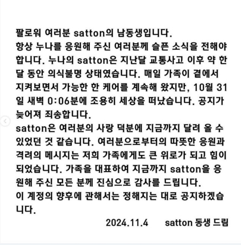 จากสื่อต่างประเทศ ได้รายงานว่า า อินฟลูเอนเซอร์ญี่ปุ่นชื่อดัง Satton เสียชีวิตแล้วในวัย 30 ปี โดยเมื่อ 4 พฤศจิกายนที่ผ่านมา น้องชายของ Satton ได้โพสต์ข้อความลงในอินสตาแกรม เปิดเผยข่าวเศร้าว่า เธอได้เสียชีวิตตั้งแต่เมื่อ 31 ตุลาคมที่ผ่านมาว่า