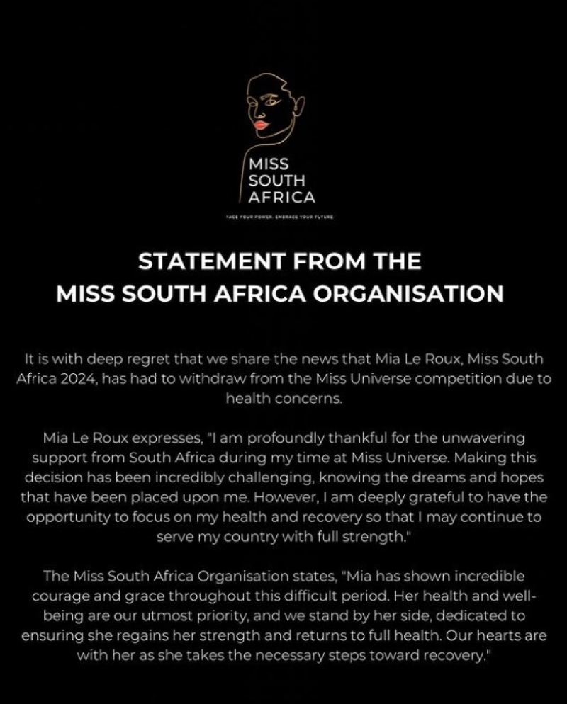 เรียกได้ว่า วันที่ 15 พ.ย. 67 เป็นการเดินรอบพรีลิมและรอบชุดประจำชาติ มิสยูนิเวิร์ส 2024 โดยสาวงามจาก127ประเทศทั่วโลก ล่าสุด ไอจี official_misssa ออกมาประกาศข่าวด่วนจากองค์กรมิสยูนิเวิร์สแอฟริกาใต้2024 ว่า สาวงามมีอา เลอรูซ มิสยูนิเวิร์สแอฟริกาใต้ ถอนตัวออกจากการประกวด เนื่องจากปัญหาสุขภาพ ระบุว่า “Mia Le Roux, Miss South แอฟริกา 2024 ต้องถอนตัวจากการประกวดนางงามจักรวาล เนื่องจากความกังวลด้านสุขภาพ