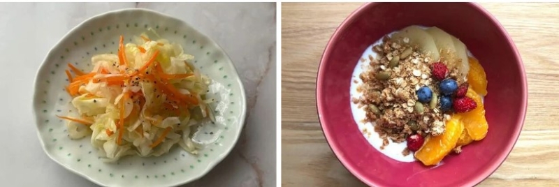 2. เพิ่มใยอาหารและอาหารหมักดอง ซาวาโกะให้ความสำคัญกับการเติมสารอาหารที่จำเป็นให้ร่างกาย โดยเธอกินอาหารที่มีใยอาหารสูง เช่น ข้าวโอ๊ต เผือก แครอท บร็อกโคลี มันหวาน และอาหารหมักดอง เช่น โยเกิร์ต น้ำส้มสายชูหมักแอปเปิ้ล เธอเตรียมอาหารเหล่านี้เป็นเมนู เช่น มันหวานต้ม สลัดกะหล่ำปลีผสมแครอทกับน้ำส้มสายชูหมัก หรือโยเกิร์ตกับข้าวโอ๊ตและผลไม้สด