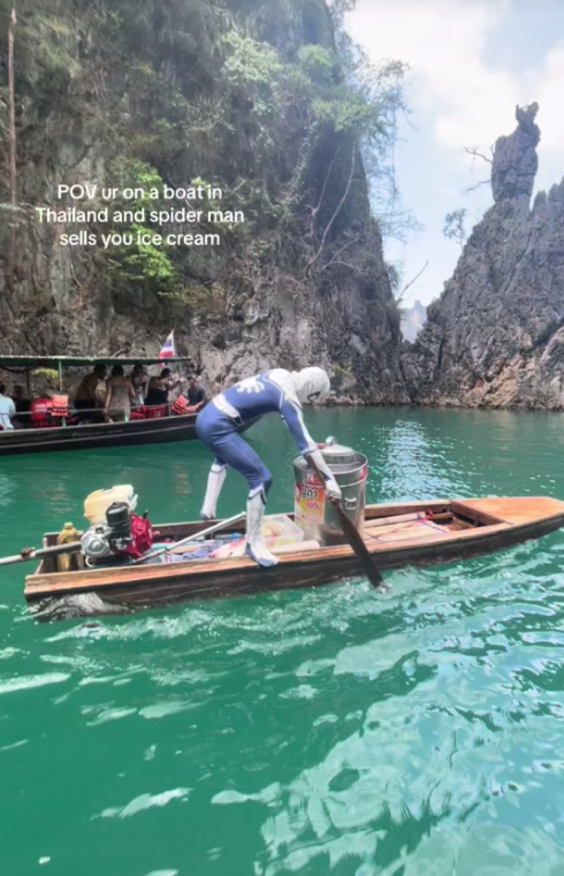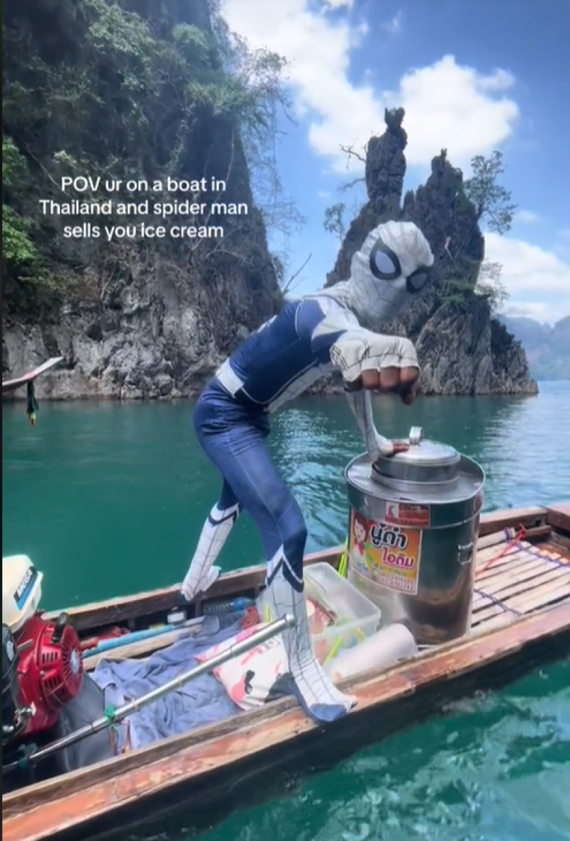 โดยในคลิปนั้น นักท่องเที่ยวได้ระบุแคปชั่นว่า Only in Thailand แปลว่า มีเฉพาะที่ไทยเท่านั้น ซึ่งในคลิปจะเห็นว่าระหว่างนั่งเรืออยู่กลางเขื่อนรัชชประภา หรือ เขื่อนเชี่ยวหลาน จ.สุราษฎร์ธานี พ่อค้านั้นใส่ชุดสไปเดอร์แมนขับเรือมาขายไอติม พร้อมชนหมัดและถ่ายรูปอย่างใกล้ชิด