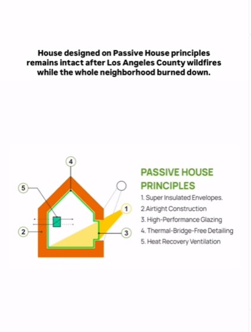 ซึ่งจากโครงสร้างที่ป้องกันความร้อนและควันได้ดี วัสดุก่อสร้างที่ไม่ติดไฟง่าย ไม่มีช่องว่างให้อากาศรั่วไหล กระจกหน้าต่างหลายชั้น จึงทำให้สามารถป้องกันความร้อน ควัน และเปลวไฟ ที่จะลุกลามมาติดตัวบ้านได้นั่นเอง