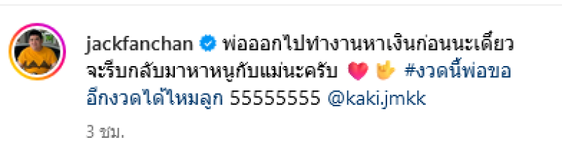 ล่าสุด แจ็ค แฟนฉัน ได้โพสต์คลิปอุ้ม น้องคากิ ขณะพูดคุยเล่นกัน พร้อมเขียนแคปชั่นว่า เอาไงดีลูกคากิ ท่ามกลางแฟนๆเข้ามาคอมเมนต์อย่างมาก อาทิ จะให้พ่อๆเดินคับ55,ผมดกดำดีจังลูก,รู้เรื่องมากเลยคากิ,น้องหน้าเหมือนแม่มาก เป็นต้น ทั้งนี้ยังโพสต์อีกว่า พ่อออกไปทำงานหาเงินก่อนนะเดี๋ยวจะรีบกลับมาหาหนูกับแม่นะครับ #งวดนี้พ่อขออีกงวดได้ไหมลูก 55555555 @kaki.jmkk