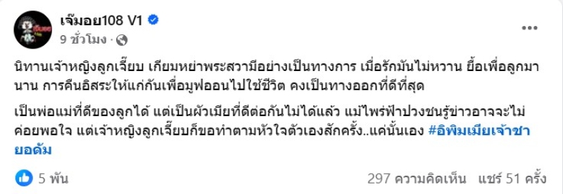 เรียกได้ว่า เป็นประเด็นใหม่ที่ทำเอาชาวเน็ตต่างต้องมาทำการบ้านอีกแล้ว เมื่อล่าสุดทางเพจดัง เจ๊มอย108 V1 ได้ออกมาโพสต์ว่า นิทานเจ้าหญิงลูกเจี๊ยบ เกียมหย่าพระสวามีอย่างเป็นทางการ เมื่อรักมันไม่หวาน ยื้อเพื่อลูกมานาน การคืนอิสระให้แก่กันเพื่อมูฟออนไปใช้ชีวิต คงเป็นทางออกที่ดีที่สุด เป็นพ่อแม่ที่ดีของลูกได้ แต่เป็นผัวเมียที่ดีต่อกันไม่ได้แล้ว แม้ไพร่ฟ้าปวงชนรู้ข่าวอาจจะไม่ค่อยพอใจ แต่เจ้าหญิงลูกเจี๊ยบก็ขอทำตามหัวใจตัวเองสักครั้ง..แค่นั้นเอง #อิพิมเมียเจ้าชายอดัม