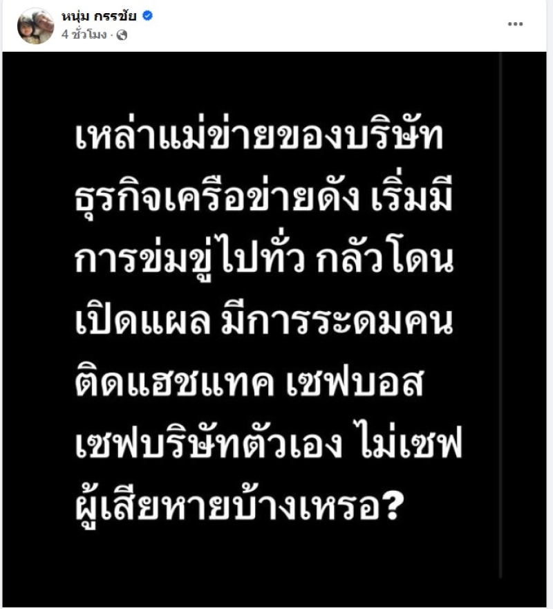 ต่อมาในวันนี้ กรรชัย โพสต์เฟสบุ๊กบอกว่า เหล่าแม่ข่ายของบริษัทธุรกิจเครือข่ายดัง เริ่มมีการข่มขู่ไปทั่ว กลัวโดนเปิดแผล มีการระดมคนติดแฮชแทค เซฟบอส เซฟบริษัทตัวเอง ไม่เซฟผู้เสียหายบ้างเหรอ?