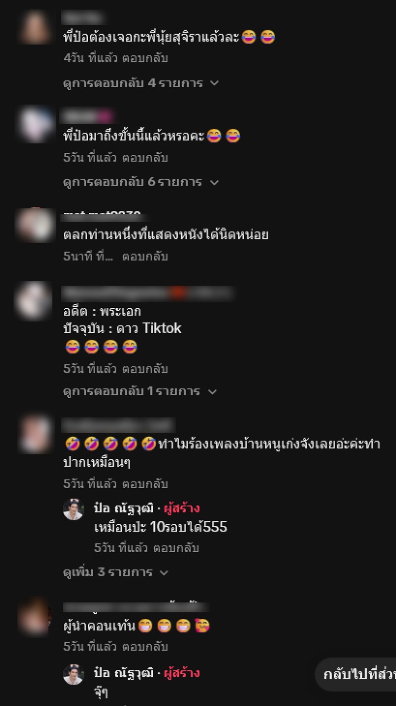 พร้อมเขียนเเคปชั่นว่า วนอยู่ในหัว เพลงเพราะดีครับ #tiktokคนบันเทิง ท่ามกลางแฟนๆเข้ามาคอมเมนต์กันอย่างมาก อาทิ พี่ป๋อต้องเจอกะพี่นุ้ยสุจิราแล้วละ,พี่ป๋อมาถึงขั้นนี้แล้วหรอคะ,ตลกท่านหนึ่งที่แสดงหนังได้นิดหน่อย,ทำไมร้องเพลงบ้านหนูเก่งจังเลยอ่ะค่ะทำปากเหมือนๆ เป็นต้น