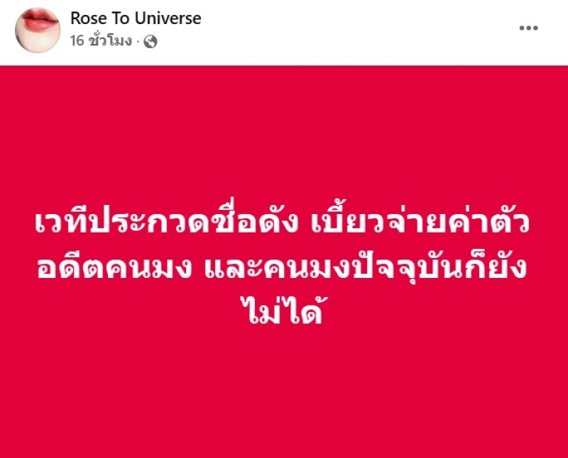 โดยทางเพจ Rose To Universe ได้ออกมาโพสต์เปิดประเด็นว่า เวทีประกวดชื่อดัง เบี้ยวจ่ายค่าตัวอดีตคนมง และคนมงปัจจุบันก็ยังไม่ได้ และยังได้คอมเมนต์ใต้โพสต์อีกด้วย