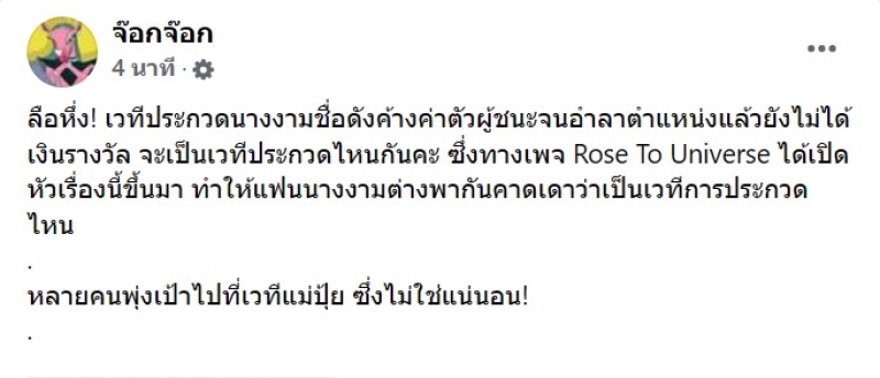 เรียกได้ว่า เป็นข่าวลืออีกครั้ง เมื่อทางเพจดัง อย่าง จ๊อกจ๊อก ได้ออกมาโพสต์ว่า ลือหึ่ง! เวทีประกวดนางงามชื่อดังค้างค่าตัวผู้ชนะจนอำลาตำแหน่งแล้วยังไม่ได้เงินรางวัล จะเป็นเวทีประกวดไหนกันคะ ซึ่งทางเพจ Rose To Universe ได้เปิดหัวเรื่องนี้ขึ้นมา ทำให้แฟนนางงามต่างพากันคาดเดาว่าเป็นเวทีการประกวดไหน . หลายคนพุ่งเป้าไปที่เวทีแม่ปุ้ย ซึ่งไม่ใช่แน่นอน