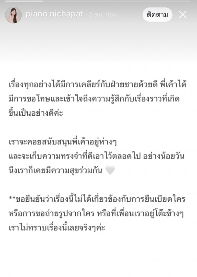 ล่าสุด ทางเปียโนได้ออกมาโพสต์ผ่านสตอรี่ โดยบอกว่าเรื่องทุกอย่างได้มีการเคลียร์กับฝ่ายชายด้วยดี พี่เค้าได้ มีการขอโทษและเข้าใจถึงความรู้สึกกับเรื่องราวที่เกิด ขึ้นเป็นอย่างดีค่ะ เราจะคอยสนับสนุนพี่เค้าอยู่ห่างๆ และจะเก็บความทรงจําที่ดีเอาไว้ตลอดไป อย่างน้อยวัน นึงเราก็เคยมีความสุขร่วมกัน