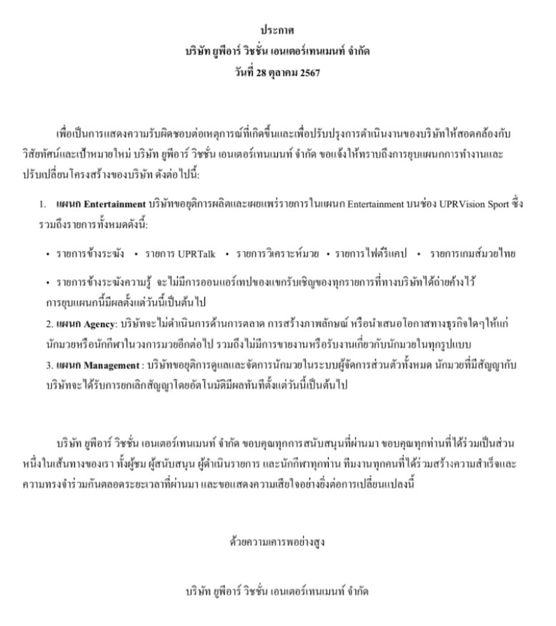 ในส่วนของแผนกอื่น ความตั้งใจของผมตั้งแต่แรกคืออยากสร้างสิ่งที่ผมเคยอยากให้มีในวันที่ผมยังเป็นนักมวย และเสียใจที่ผมทำมันไม่สำเร็จ ขอขอบคุณทุกคนที่ได้ร่วมเดินทางและเชื่อใจกันตั้งแต่วันแรก และขอโทษทุกฝ่ายสำหรับทุกเหตุการณ์ที่เกิดขึ้น
