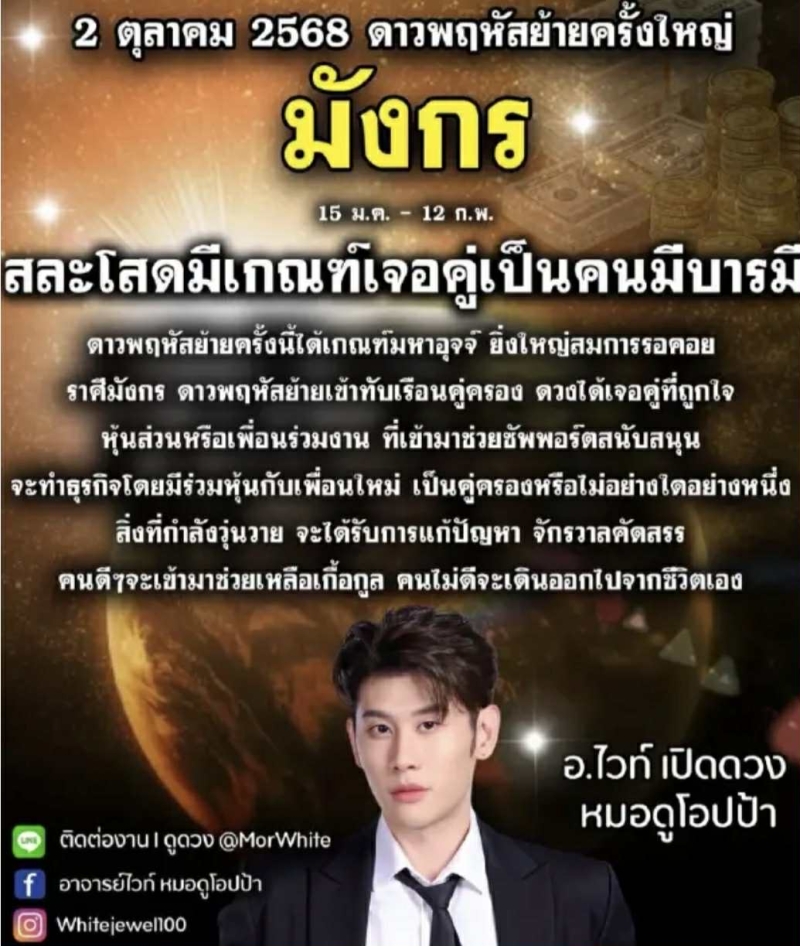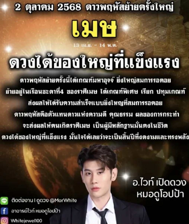 เรียกได้ว่า หลายคนคงรู้จัก กับ อาจารย์ไวท์ หมอดูโอปป้า นักพยากรณ์ชื่อดัง ออกมาเปิดคำทำนายครั้งใหญ่ 2 ตุลาคม 2568 ถึงการย้ายของ ดาวพฤหัส ดาวแห่งคุณธรรม ความสำเร็จ และการเติบโต ส่งผลแรงชัดเจนกับ 2 ราศี ที่เตรียมรับข่าวดีครั้งสำคัญในชีวิต ผ่านเฟซบุ๊ก อาจารย์ไวท์ หมอดูโอปป้า