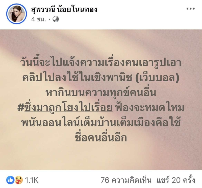 โดย มีเขียนข้อความว่า มีผู้ไม่หวังดีนำรูปภาพ และวิดีโอของตนไปใช้โปรโมตเว็บพนันบอล พร้อมวิพากษ์วิจารณ์ว่า การใช้ชื่อคนอื่นมาแสวงหาผลประโยชน์บนความเดือดร้อนของสังคม เป็นสิ่งที่ไม่ควรถูกมองข้าม