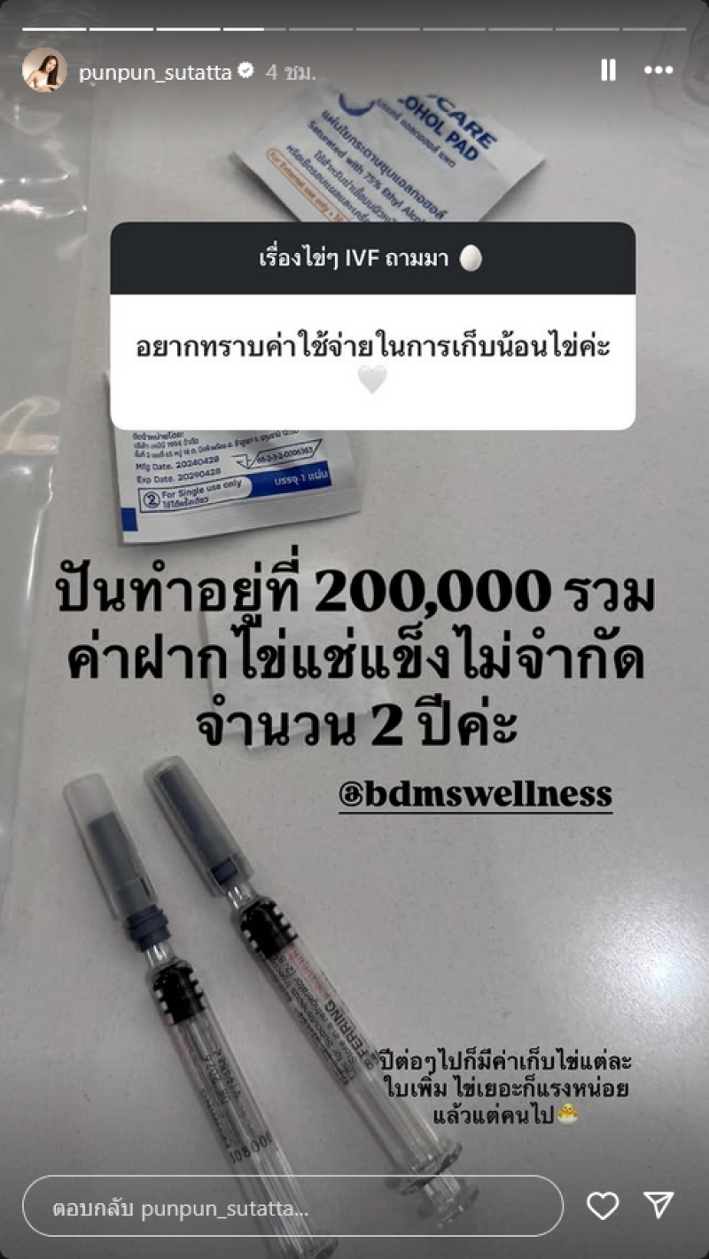ปันปัน : เพราะตอนนี้ปันยังไม่อยากมีลูก แต่รู้ว่าร่างกายมีปัญหาทำให้ท้องยาก (PCOS รวนๆ) เลยเลือกเก็บไข่ไว้ก่อน เผื่ออนาคตพร้อมแล้วแต่ท้องไม่ได้เอง ก็จะได้มีแผนสำรองไว้ ยังไงไข่ ก็ไข่เรา เก็บไว้ก่อน