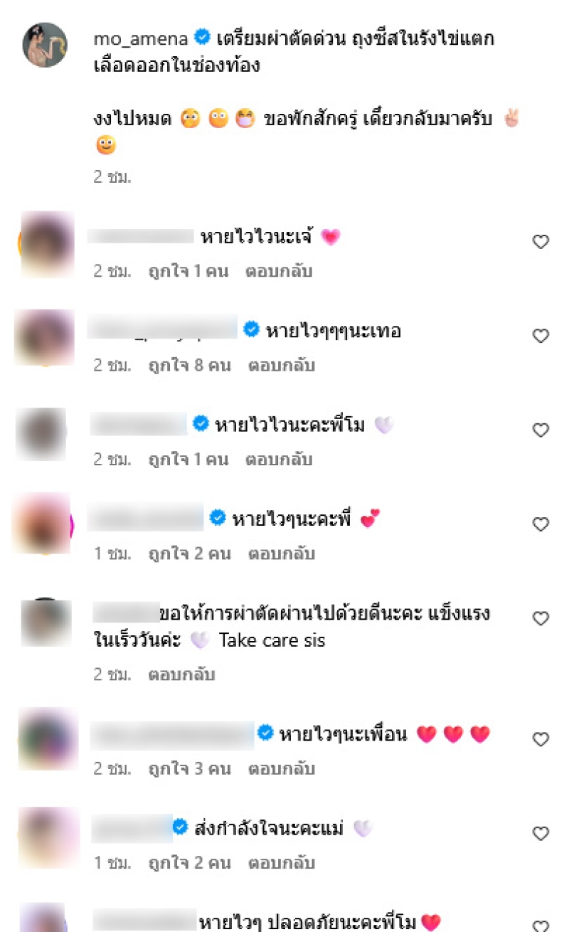 โดยมีหลายคนต่างเข้ามาคอมเมนต์ส่งกำลังใจอาทิ หายไวๆๆๆนะเทอ,ขอให้การผ่าตัดผ่านไปด้วยดีนะคะ แข็งแรงในเร็ววันค่ะ Take care sis,ส่งกำลังใจนะคะแม่,หายไวๆ ปลอดภัยนะคะพี่โม,ขอให้ราบรื่นปลอดภัยหายเจ็บไวๆนะลูก,หายไวๆครับน้องโม เป็นต้น