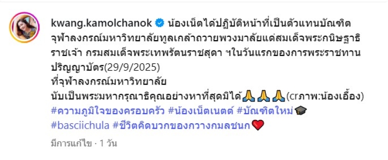 โดย ได้เผยว่า น้องเน็ตได้ปฏิบัติหน้าที่เป็นตัวแทนบัณฑิตจุฬาลงกรณ์มหาวิทยาลัยทูลเกล้าถวายพวงมาลัยแด่สมเด็จพระกนิษฐาธิราชเจ้า กรมสมเด็จพระเทพรัตนราชสุดา ฯในวันแรกของการพระราชทานปริญญาบัตร(29/9/2025) ที่จุฬาลงกรณ์มหาวิทยาลัย