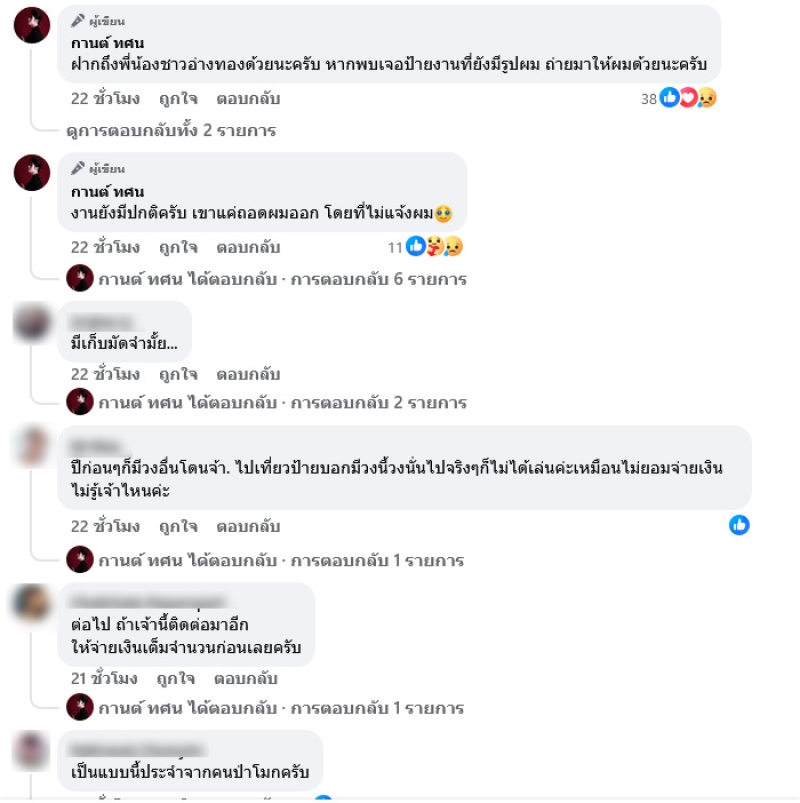 เจ้าเก่าเจ้าเดิมหลายรอบแล้วด้วย แล้วก็งานนี้ก็เป็นงานสุดท้ายของเจ้านี้ที่มีในตารางงานผม ผมก็กะว่าจะไม่มีปัญหาอะไรแล้ว สรุปเอาอีกแล้วเหรอ ผมฟ้องได้นะครับ เพราะยังเห็นโปสเตอร์และป้ายที่ติดตามทางยังใช้ที่มีรูปผมอยู่ในการโปรโมท จะยกเลิกหรือเลื่อนวันอะไรไม่แจ้งผมเลยเหรอครับ ซึ่งงานยังมีปกติ แต่เขาถอดผมออก โดยไม่แจ้งอะไรผมเลย