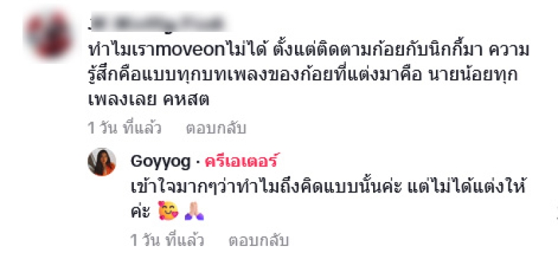 ท่ามกลางชาวเน็ตต่างเข้ามาคอมเมนต์โยงไปที่ถูกอดีตคนรักอย่าง นิกกี้ ณฉัตร โดยระบุว่า ทำไมเรา move on ไม่ได้ ตั้งแต่ติดตามก้อยกับนิกกี้มา ความรู้สึกคือแบบทุกบทเพลงของก้อยที่แต่งมาคือ นายน้อยทุกเพลงเลย คหสต ทั้งนี้ ก้อย ได้เข้ามาตอบกลับทันทีว่า เข้าใจมากๆ ว่าทำไมถึงคิดแบบนั้นค่ะ แต่ไม่ได้แต่งให้ค่ะ