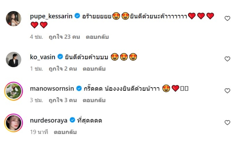 โดยสาว มะเหมี่ยว ได้โพสต์ทั้งภาพและคลิปโมเมนต์ พร้อมระบุแคปชั่นสั้นๆว่า Yes ท่ามกลางแฟนด้วยเพื่อนๆในวงการต่างเข้ามาแสดงความยินดีจำนวนมาก