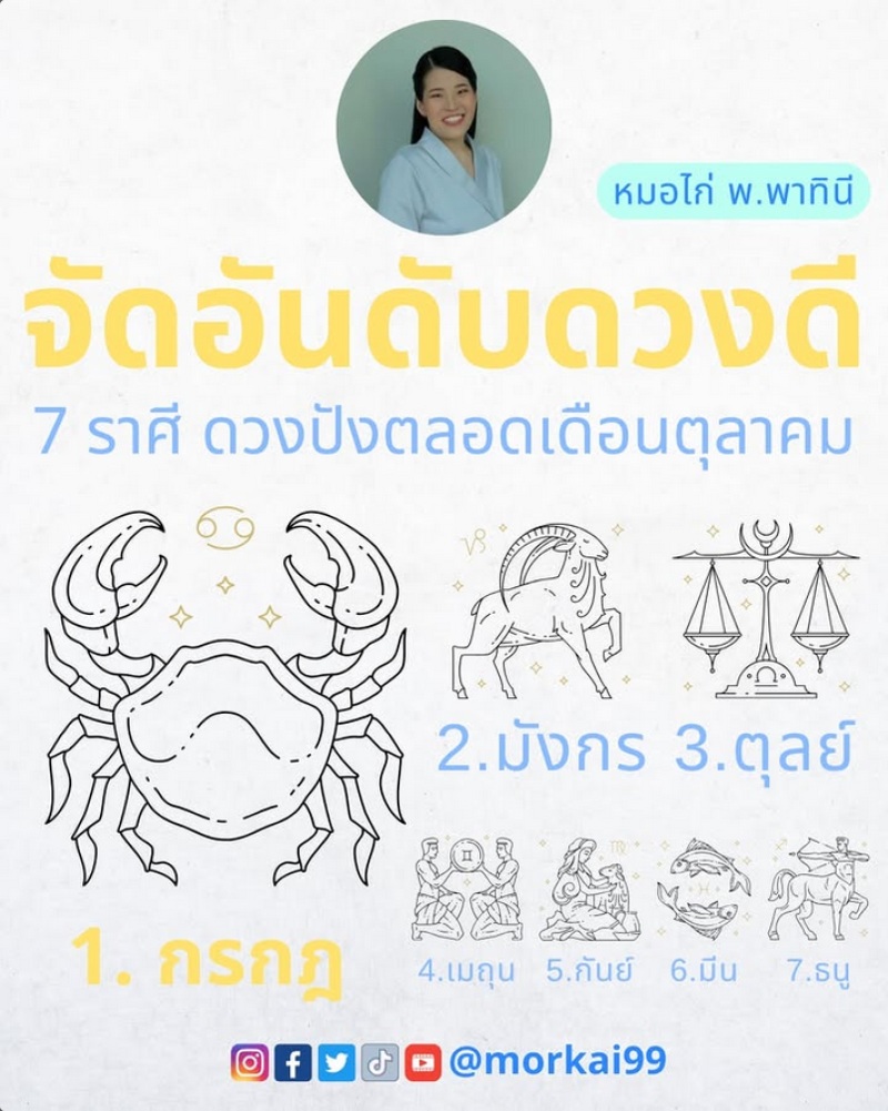 ล่าสุดนักพยากรณ์ดังอย่าง หมอไก่ พ.พาทินี ได้จัดอันดับดวงดี 7 ราศี ดวงปังตลอดเดือนตุลาคม 2568 ระบุว่า จัดอันดับดวงดี 7 ราศี ดวงปังตลอดเดือนตุลาคม 2568 ได้แก่
