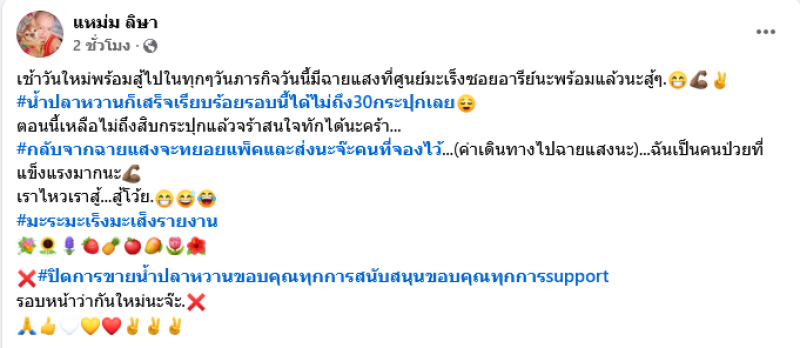 #กลับจากฉายแสงจะทยอยแพ็คและส่งนะจ๊ะคนที่จองไว้ (ค่าเดินทางไปฉายแสงนะ) ฉันเป็นคนป่วยที่แข็งแรงมากนะ เราไหวเราสู้สู้โว้ย #มะระมะเร็งมะเส็งรายงาน #ปิดการขายน้ำปลาหวานขอบคุณทุกการสนับสนุนขอบคุณทุกการsupport รอบหน้าว่ากันใหม่นะจ๊ะ