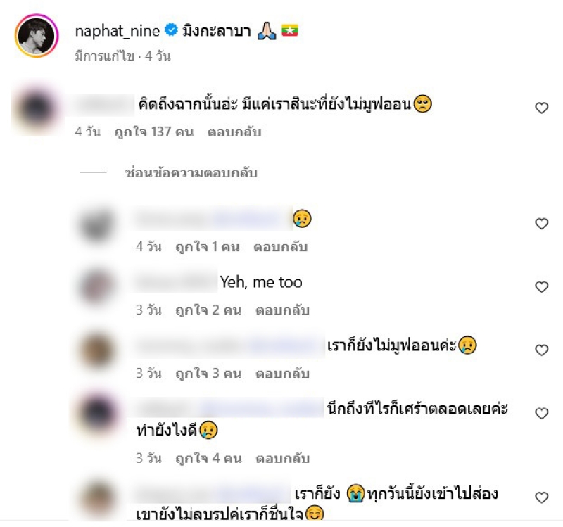 แต่ทว่า ด้านแฟนคลับนั้นได้เผยว่า ภาพแวบเข้ามาหัวทันที เหมือนฉากในหนังเลย และมีหลายๆคนต่างไม่มูฟออนกันเพียบ เช่น คิดถึงฉากนั้นอ่ะ มีแค่เราสินะที่ยังไม่มูฟออน,ทุกวันนี้ไม่กล้าดูหนัง friend zone อีกเลย อยากอธิฐานขอให้มีเรื่องดีๆเกิดขึ้น จะได้กลับไปดูอย่างมีความสุขอีกครั้ง ขอให้ปาล์มได้เจอกิ๊งอีกนะ,ยังรัก และคิดถึงนายกับใบเหมือนเดิมนะคะ ดูเฟรนโซน ดูสร้อยสบันงา วนหลายรอบ ในใจมีแต่ความเสียดาย อยากเห็น นายและใบในโมเม้นที่ยิ้มกว้างๆ ด้วยความสุขค่ะ เป็นต้น