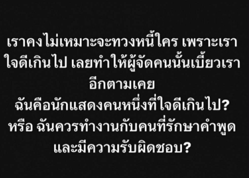 โดย มีข้อความว่า เราใจดีเกินไป จนไม่เหมาะกับการทวงหนี้ ทำให้ผู้จัดคนนั้นเบี้ยวเราอีกตามเคย ฉันควรทำงานกับคนที่รักษาสัญญา และมีความรับผิดชอบมากกว่านี้หรือเปล่า พร้อมแคปชันสั้นๆ แต่สะท้อนความเจ็บใจว่า เฮ้อออออ น่าเศร้าใจ โคตรห่วย