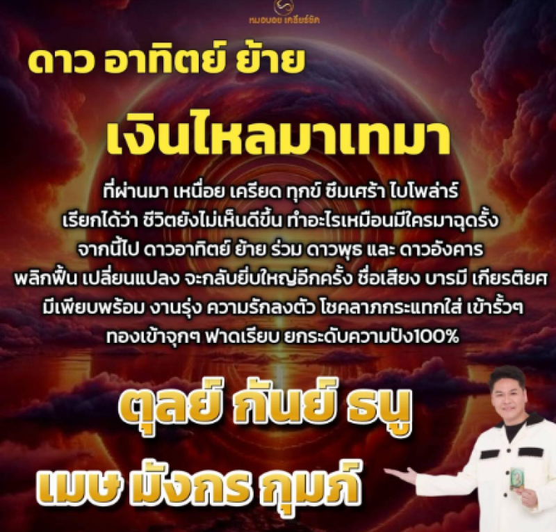 โดย หมอบอย เผยว่า หลังจากช่วงเวลาที่หลายคนรู้สึกเหนื่อย เครียด หรืออึดอัด ราวกับมีแรงต้านชีวิตเข้ามากดดัน ดาวอาทิตย์กำลังย้ายตำแหน่ง ส่งสัญญาณการฟื้นตัว ทั้งด้านการเงิน งาน และโอกาสใหม่ๆ
