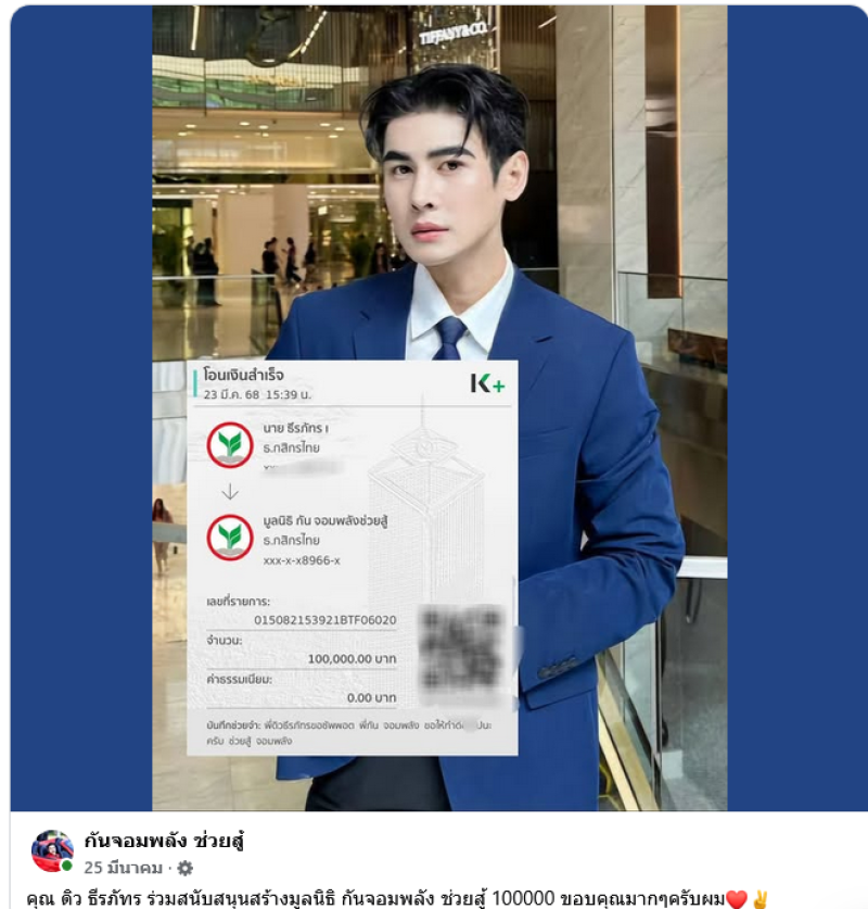 จากกรณีประเด็นดราม่าร้อนแรงของมูลนิธิกันจอมพลัง ล่าสุดทางด้านอินฟลูชื่อดังอย่าง ดิว ธีรภัทร ที่เคยบริจาคเงินให้กัน จอมพลัง 100,000 บาท ได้ออกมาเคลื่อนไหวถึงการขอเงินคืนจากกันว่า จากกรณี กระเเสคนทำดี พี่ดิวธีรภัทรคนนึง ที่เคยบริจาคให้คุณกัน จอมพลัง 100,000 แสนบาท