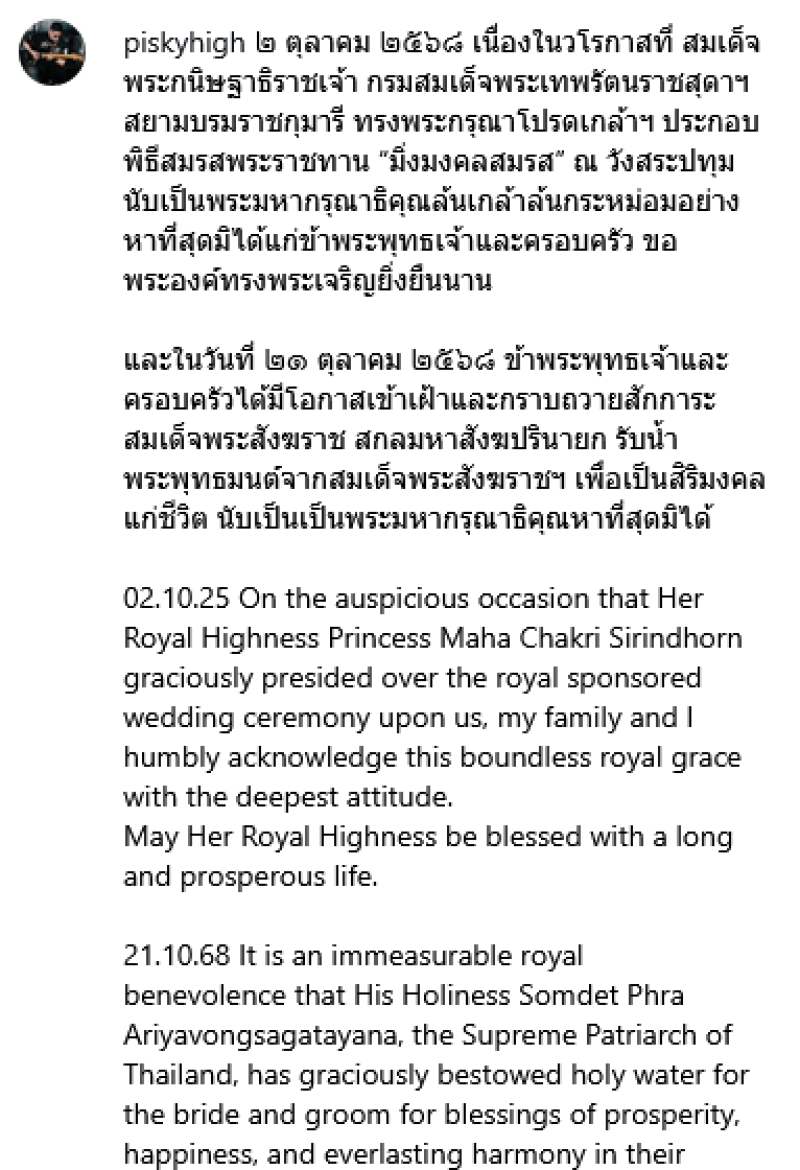 ล่าสุดคู่รักอย่างสำหรับนักแสดงสาวชื่อดัง มายด์ ลภัสลัล และแฟนหนุ่ม พาย สุนิษฐ์ ภิรมย์ภักดี ทายาทตระกูลผู้ดีเก่าแห่งวงการธุรกิจไทย ได้ออกมาโพสต์ภาพงดงามพร้อมเขียนข้อความสุดปลื้มปิติว่า ๒ ตุลาคม ๒๕๖๘ เนื่องในวโรกาสที่ สมเด็จพระกนิษฐาธิราชเจ้า กรมสมเด็จพระเทพรัตนราชสุดาฯ สยามบรมราชกุมารี ทรงพระกรุณาโปรดเกล้าฯ ประกอบพิธีสมรสพระราชทาน มิ่งมงคลสมรส