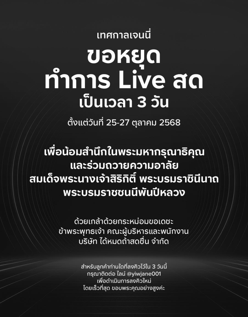 ทั้งนี้ทางด้าน เจนนี่ รัชนก หรือ เจนนี่ ได้หมดถ้าสดชื่น ได้มีการออกประกาศถึงการไลฟ์สดว่า ข้าพระพุทธเจ้า ผู้บริหารและพนักงาน บริษัท ได้หมดถ้าสดชื่น จำกัด ขอหยุดทำการ Live สด เป็นเวลา 3 วัน ตั้งเเต่วันที่ 25-27 ตุลาคม 2568 เพื่อน้อมสำนึกในพระมหากรุณาธิคุณเเละร่วมถวายความอาลัย สมเด็จพระนางเจ้าสิริกิติ์ พระบามราชินีนาถ พระบรมราชชนนีพันปีหลวง