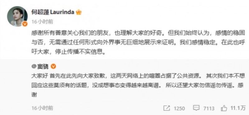 และ เหอเชาเหลียน ก็ออกมาคอมเมนต์ตอบกลับสุดอบอุ่นว่า “ความรักไม่จำเป็นต้องพิสูจน์ให้ใครเห็น เราโอเคและยังรักกันเหมือนเดิม”