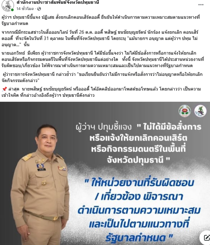 จากกรณีประเด็นดราม่าของนักร้องหนุ่ม ออดี้ พสิษฐ์ ธนชัยบุญยรัตน์ แจ้งยกเลิก คอนเสิร์ตออดี้ ที่จะจัดในวันที่ 31 ตุลาคม ในพื้นที่จังหวัดปทุมธานี โดยระบุ แม้นายกฯ อนุญาต แต่ผู้ว่าฯ ปทุม ไม่อนุญาต ล่าสุดเมื่อวันที่ 26 ตุลาคม 2568 ทางเพจประชาสัมพันธ์จังหวัดปทุมธานี ได้ออกมาชี้แจงว่า