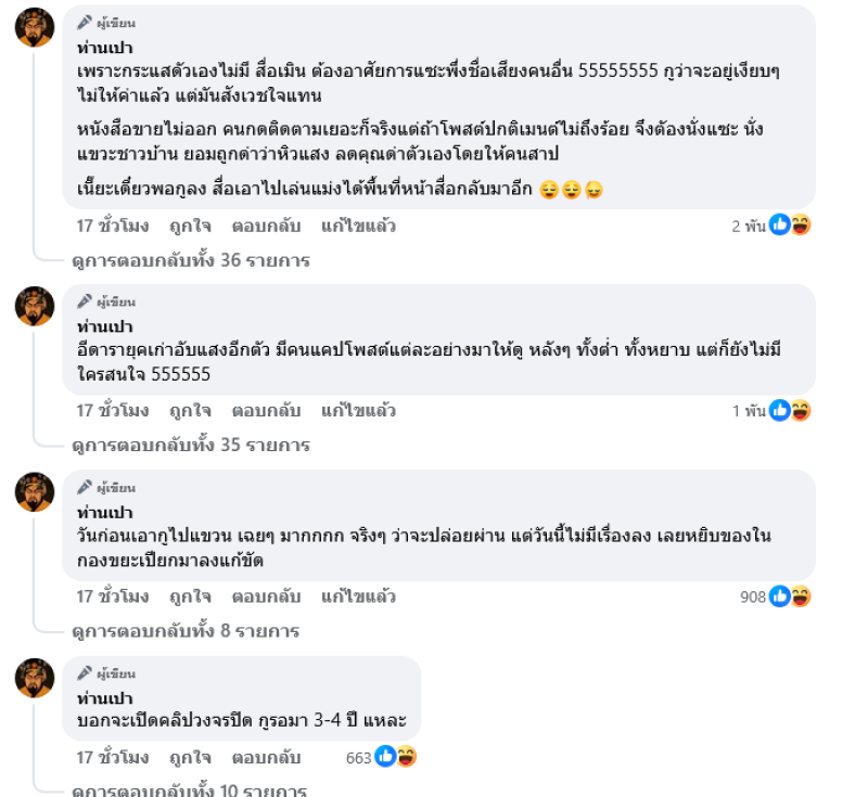 เพราะกระแสดัวเองไม่มี สื่อเมิน ต้องอาศัยการแซะพึ่งชื่อเสียงคนอื่น 55555555 กูว่าจะอยู่เงียบๆ ไม่ให้ค่าแล้ว แต่มันสังเวชใจแทน หนังสือขายไม่ออก คนกดติดตามเยอะก็จริงแต่ถ้าโพสต์ปกติเมนต์ไม่ถึงร้อย จึงตัองนั่งแซะ นั่งแขวะชาวบ้าน ยอมถูกด่าว่าหิวแสง ลดคุณด่าตัวเองโดยให้คนสาป เนี๊ยะเดี๋ยวพอกูลง สื่อเอาไปเล่นแม่งได้พื้นที่หน้าสื่อกลับมาอีก