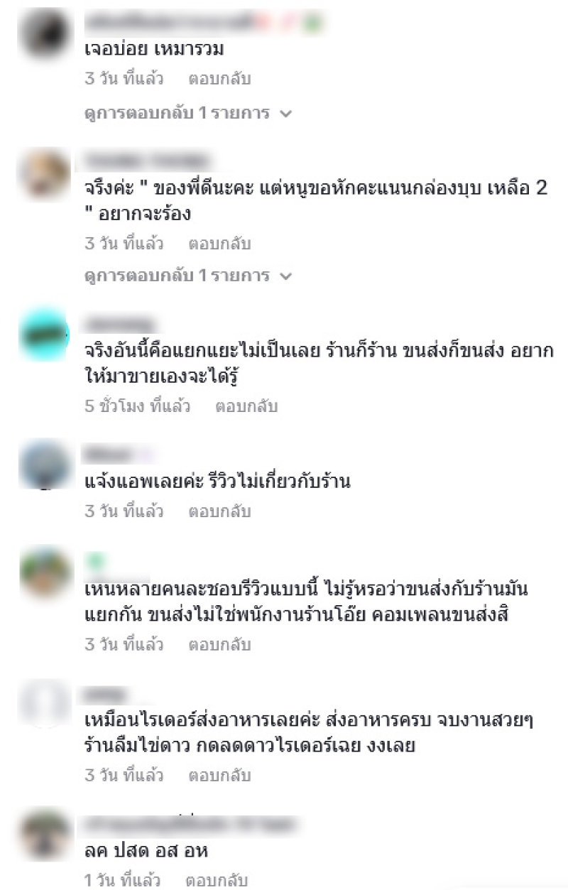 ทั้งนี้หลังจากที่คลิปดังกล่าวได้เผยแพร่ได้มีชาวเน็ตเข้ามาคอมเมนต์ในเชิงเดียวกันว่า เป็นฉันก็รีวิวแบบนี้ค่ะ คุณต้องไปบอกขนส่งเองค่ะเพราะคุณจ้างขนส่งดังนั้นคุณต้องบอกเขาว่าให้โทรหา ของฉันก็เหมือนกัน แต่ไม่ได้สั่งสินค้าคุณ