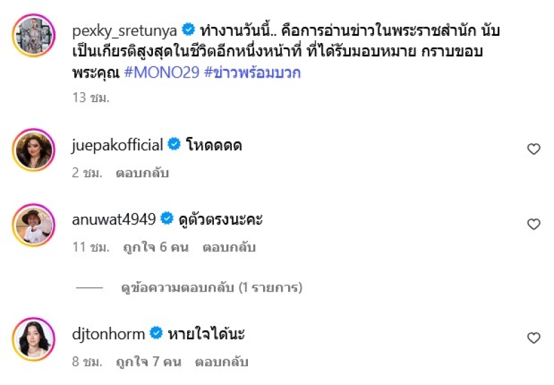 โดยได้เผยว่า ทำงานวันนี้.. คือการอ่านข่าวในพระราชสำนัก นับเป็นเกียรติสูงสุดในชีวิตอีกหนึ่งหน้าที่ ที่ได้รับมอบหมาย กราบขอบพระคุณ #MONO29 #ข่าวพร้อมบวก