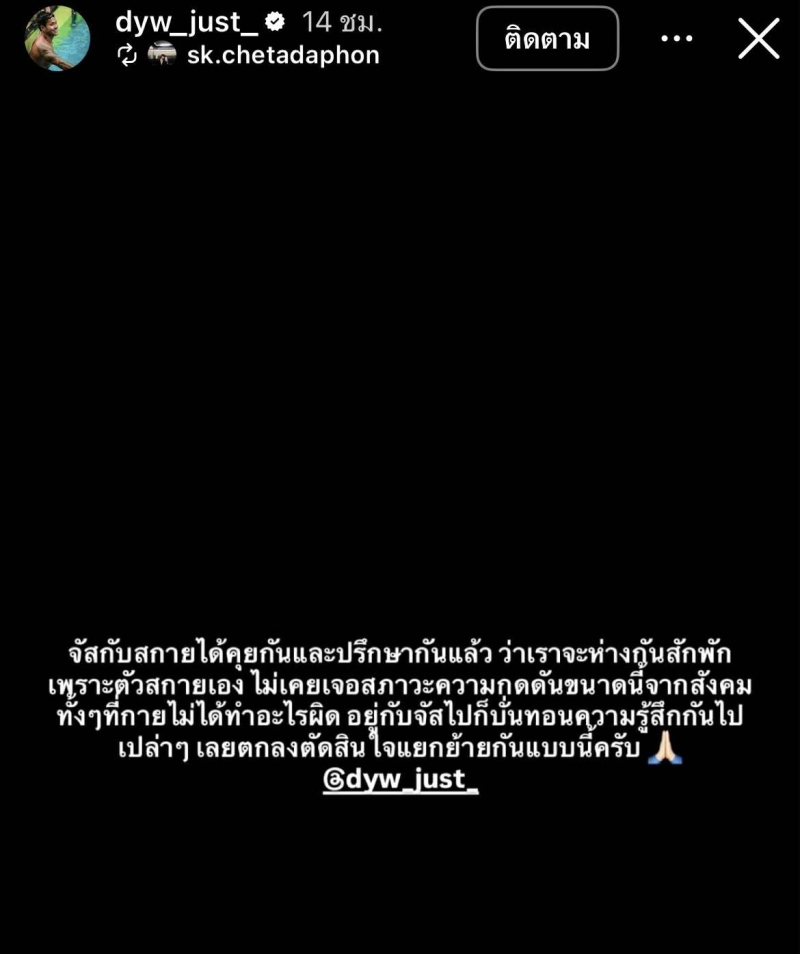 ด้านหนุ่ม สกาย ก็ได้โพสต์ข้อความสื่อความในใจ ระบุว่า ทั้งคู่ ได้พูดคุยกันอย่างเปิดใจทและเข้าใจกันดี ก่อนจะตกลงกันว่า จะพักความสัมพันธ์ไว้ก่อน เพื่อให้ต่างฝ่ายได้ใช้เวลาอยู่กับตัวเอง พร้อมยอมรับว่า ความกดดันจากภายนอกเป็นสิ่งที่ไม่ง่ายจะรับมือ