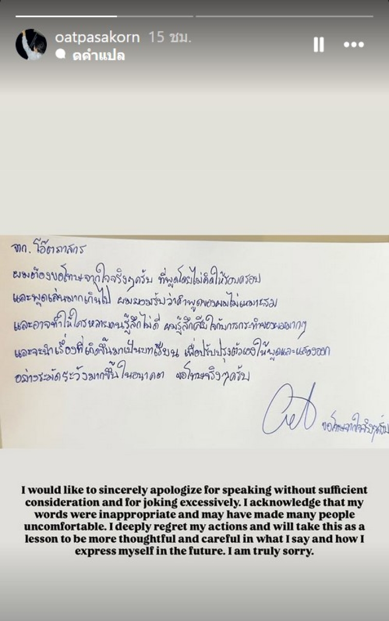 ล่าสุด ทางด้าน โอ๊ต ก็ได้โพสต์ข้อความลายมือขอโทษโดยระบุว่า ผมต้องขอโทษจากใจจริงๆ ครับ ที่พูดโดยไม่คิดให้รอบครอบและพูดเล่นมากเกินไป ผมยอมรับว่าคำพูดของผมไม่เหมาะสมและอาจทำให้ใครหลายคนรู้สึกไม่ดี