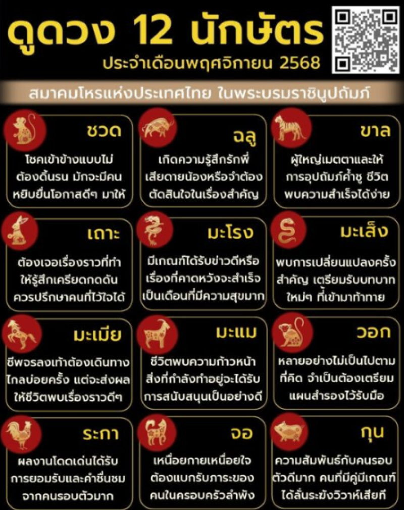 สมาคมโหร เปิดดวง 12 นักษัตร ประจำเดือนพฤศจิกายน 2568