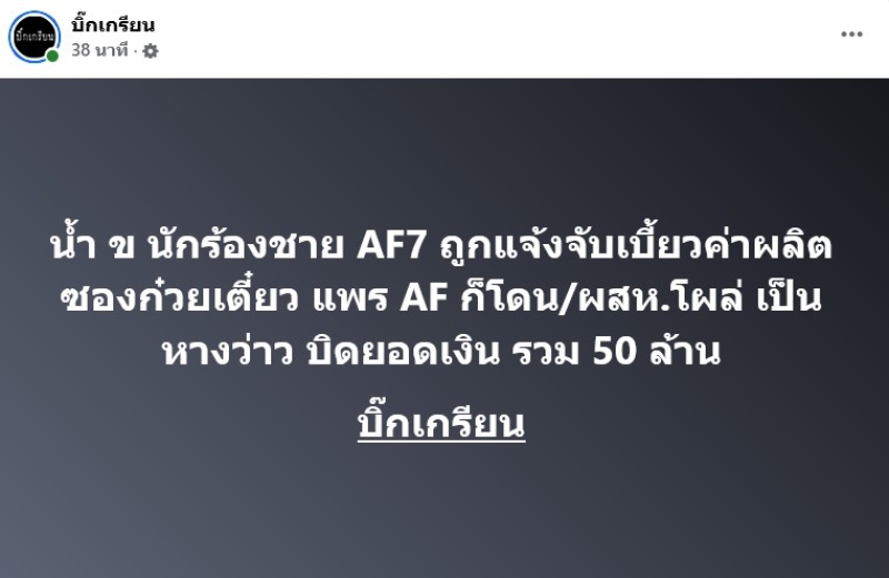และโพสต์ต่อมา ได้เผยว่า น้ำ ข นักร้องชาย AF7 ถูกแจ้งจับเบี้ยวค่าผลิตซองก๋วยเตี๋ยว แพร AF ก็โดน/ผสห.โผล่ เป็นหางว่าว บิดยอดเงิน รวม 50 ล้าน