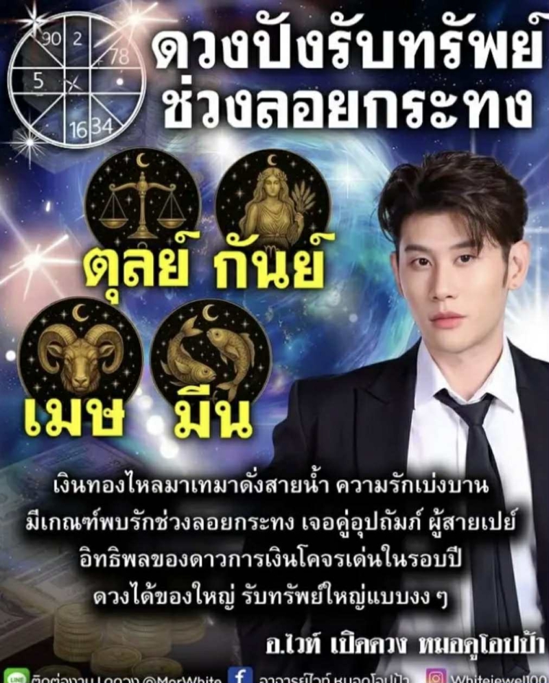 เรียกได้ว่า เป็นช่วงเวลาสุดปังของปีที่พลังแห่งดวงดาวส่งผลชัด เฉพาะช่วงเทศกาลลอยกระทง 2568 ที่นักพยากรณ์ชื่อดัง อ.ไวท์ หมอดูโอปป้า ออกมาเปิดคำทำนายแรง เผยมี 4 ราศีที่ชีวิตกำลังขึ้นสุดๆ ทั้งเรื่องเงิน ความรัก และโอกาสใหม่ๆ ที่พร้อมหลั่งไหลเข้ามาไม่หยุด