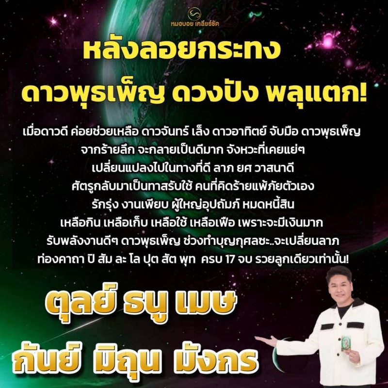 ตุลย์ ธนู เมษ กันย์ มิถุน มังกร โดยราศีนี้ หลังลอยกระทง ดาวพุธเพ็ญ ดวงปัง พลุแตก! เมื่อดาวดีค่อยช่วยเหลือ ดาวจันทร์เล็งดาวอาทิตย์ จับมือดาวพุธเพ็ญ จากร้ายลึกจะกลายเป็นดีมาก จังหวะที่เคยแย่ๆ เปลี่ยนแปลงไปในทางที่ดี ลาภยศ วาสนาดี ศัตรูกลับมาเป็นทาสรับใช้ คนที่คิดร้ายแพ้ภัยตัวเอง รักรุ่ง งานเพียบ ผู้ใหญ่อุปถัมภ์ หมดหนี้สิน เหลือกิน เหลือเก็บ เหลือใช้ เหลือเฟือ เพราะจะมีเงินมาก รับพลังงานดีๆ ดาวพุธเพ็ญ ช่วงทำบุญกุศลซะ..จะเปลี่ยนลาภ