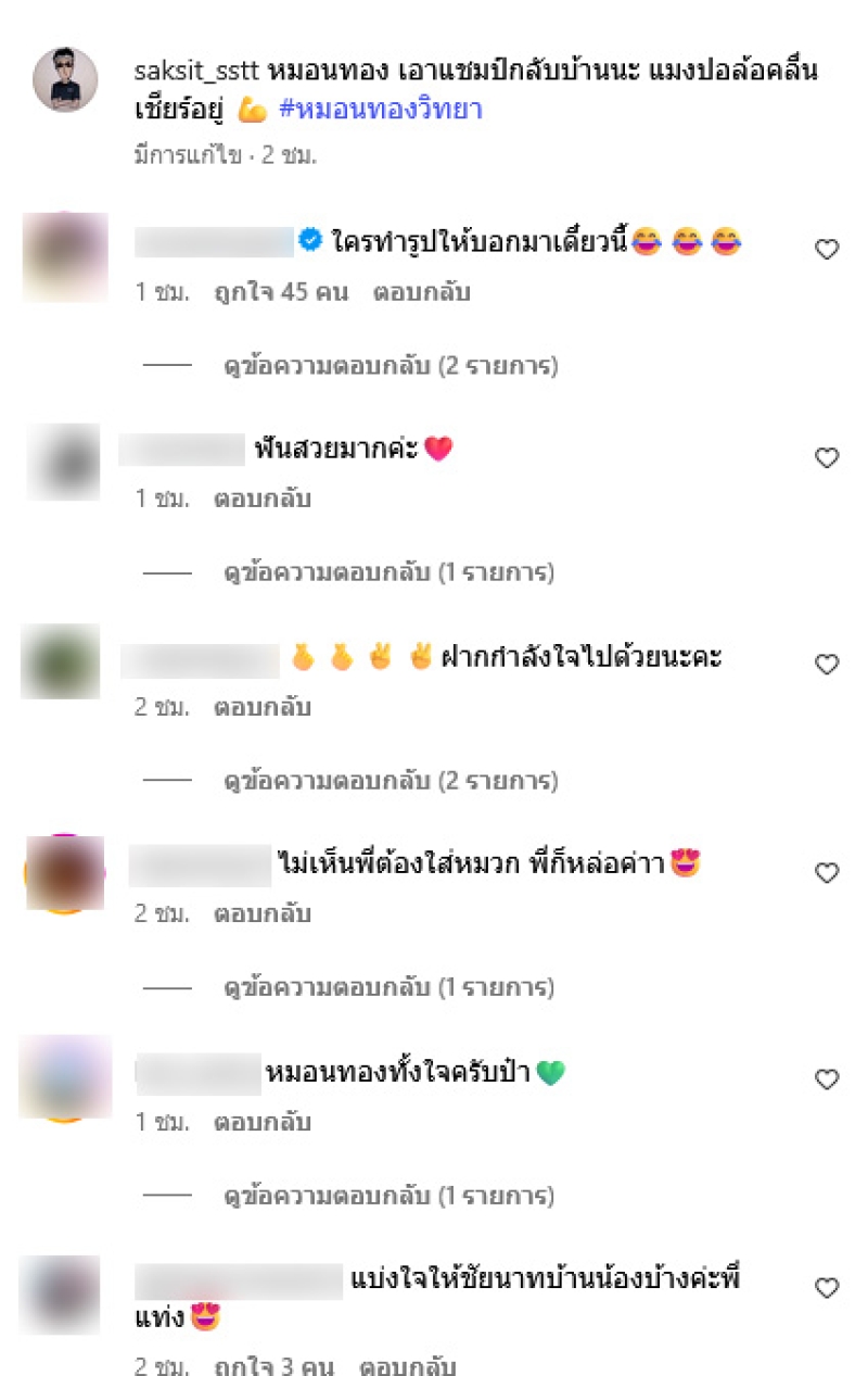 พร้อมระบุเเคปชั่นว่า หมอนทอง เอาแชมป์กลับบ้านนะ แมงปอล้อคลื่น เชียร์อยู่ #หมอนทองวิทยา ท่ามกลางแฟนๆต่างเข้ามาคอมเมนต์ส่งกำลังใจเชียร์กันเป็นอย่างมาก